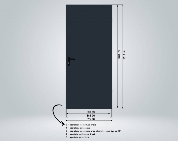 Drzwi są dostępne w wymiarach zewnętrznych (ramy): 741x2115 mm, 770x2010 mm, 841x2115 mm, 895x2010 mm, 941x2115 mm, 1041x2115.