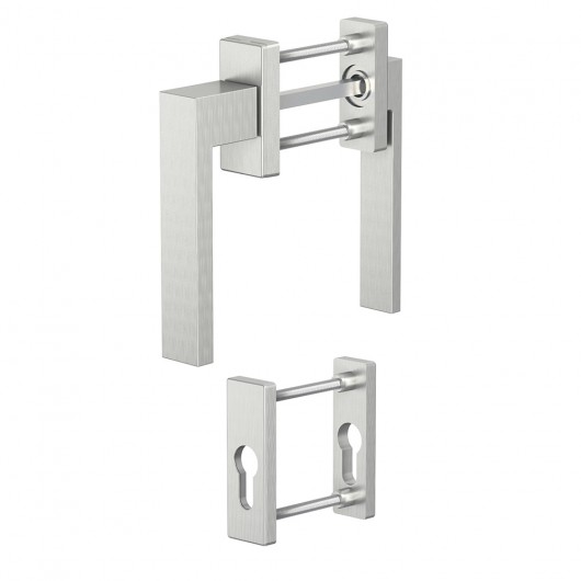 Klamka balkonowa pod roletę, obustronna w zestawie z kompletem rozet, trzpieniem oraz śrubami montażowymi.